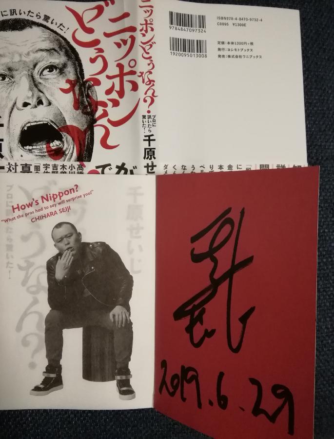 いま世間を騒がせている吉本所属芸人千原せいじの本付き、サインと写メも撮ってもらえて、トークショーはほとんど闇営業に関する話で面白かったです。千原せいじさんは、背がデカイ、顔デカイ、声デカイ、態度も。。すべてがデカイ人でした。 (ちょいぽちゃ)