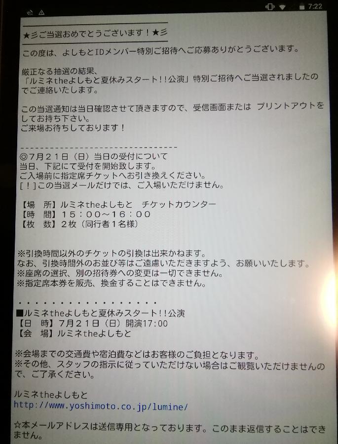 宮迫&ロンブー亮の会見当日に当選しました。闇当選じゃないです(笑)ピン芸人あべこうじのトークが案外面白かったです。ミキのアナ雪の歌ネタがめちゃくちゃオモロかった。今年のM-1優勝決定!あっ、でも今年M-1ないかも(涙) (ちょいぽちゃ)