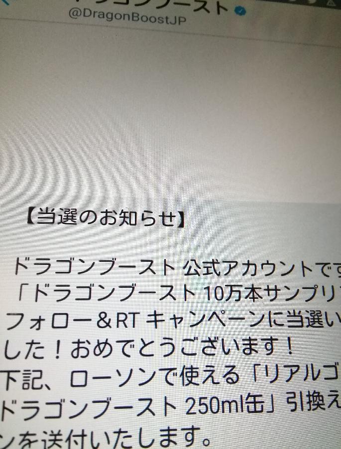 ツイッターのフォロー&リツイートで初めて当たりました!懸賞でしかツイッター使ってないから一生当たらないと思ってたけど、毎日ポチポチした甲斐がありました。小さなことからコツコツと!次はローソンどらもっち当てたいです。 (ちょいぽちゃ)
