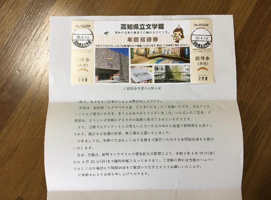 展覧会のアンケートを記入すると抽選で招待券が当たりました。コロナウイルスが終息したら文学館に足を運びたいです。 (雪猫)