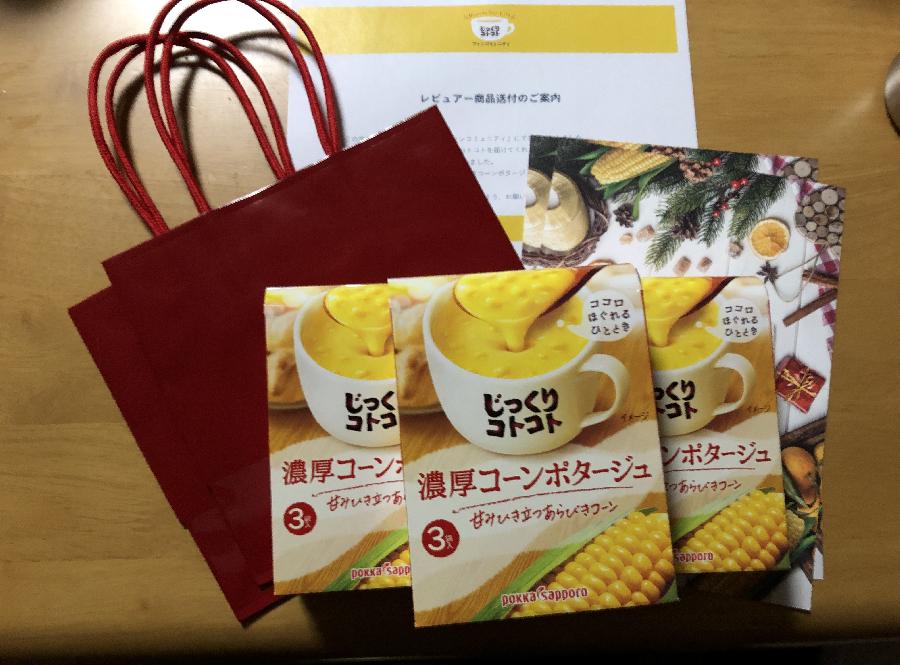 じっくりコトコト濃厚ポタージュ3箱、オリジナルクリスマスカード2枚、オリジナル手提げ袋2枚