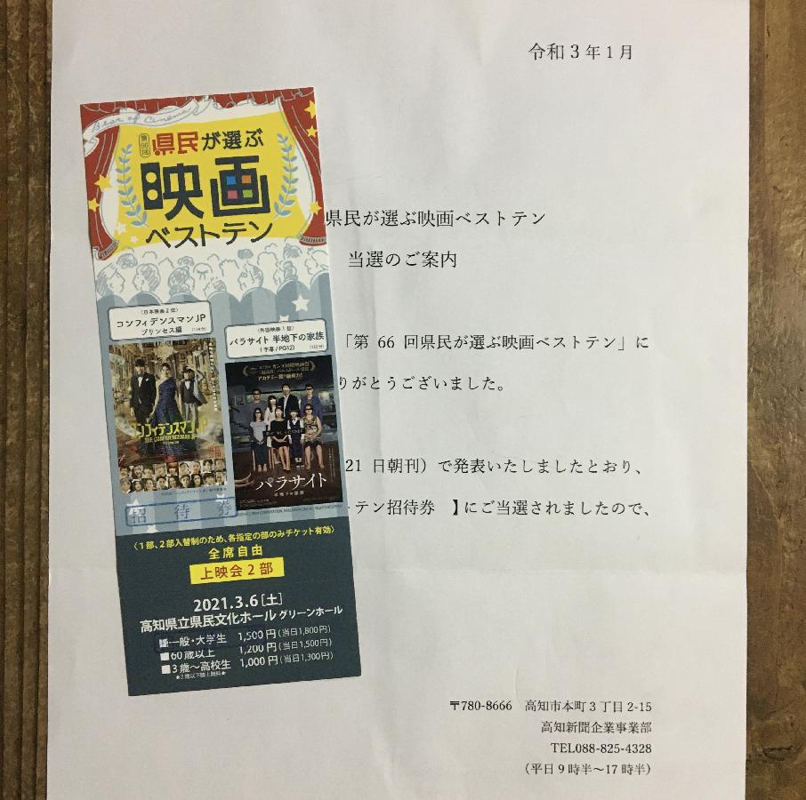毎年県民が選ぶ映画ベストテンに投票していて今年初めて当選しました。『パラサイト』が観たかったので嬉しいです。ありがとうございます。 (雪猫)