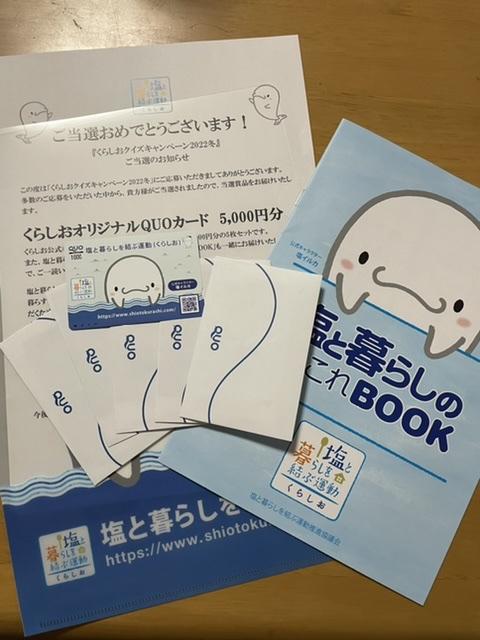 くらしおオリジナルQUOカード5,000円分、塩と暮らしのあれこれBOOK、クリアファイル