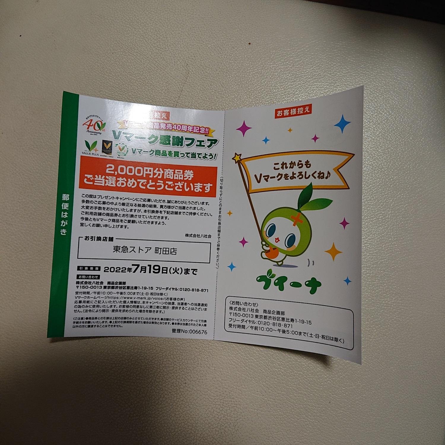 いつも購入しているので、当選してうれしいです。また、この商品券でVマーク商品を購入します。 (こまめ)