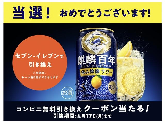 キャンペーン:【コンビニ無料引き換えクーポン】その場で当たる❗ 新発売の「麒麟百年 極み檸檬サワー」が当たるキャンペーン