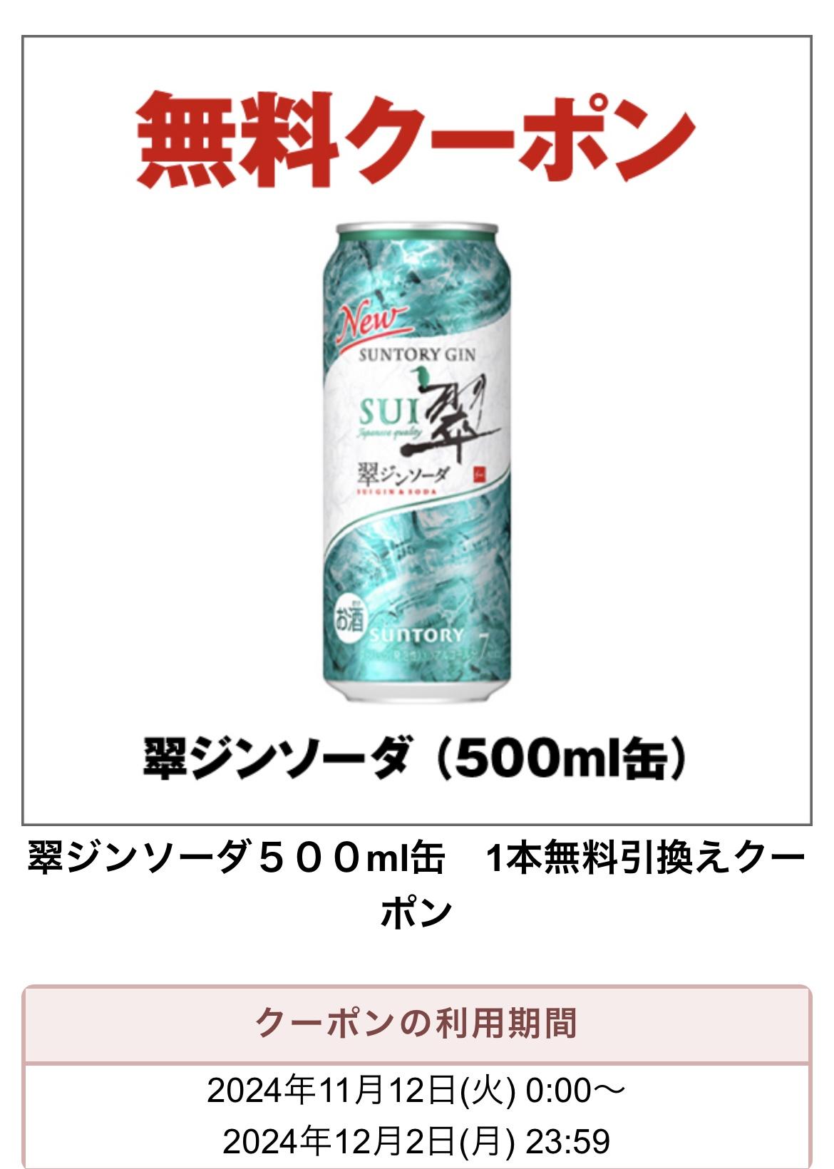 翠ジンソーダ500ml缶 1本無料引換えクーポン