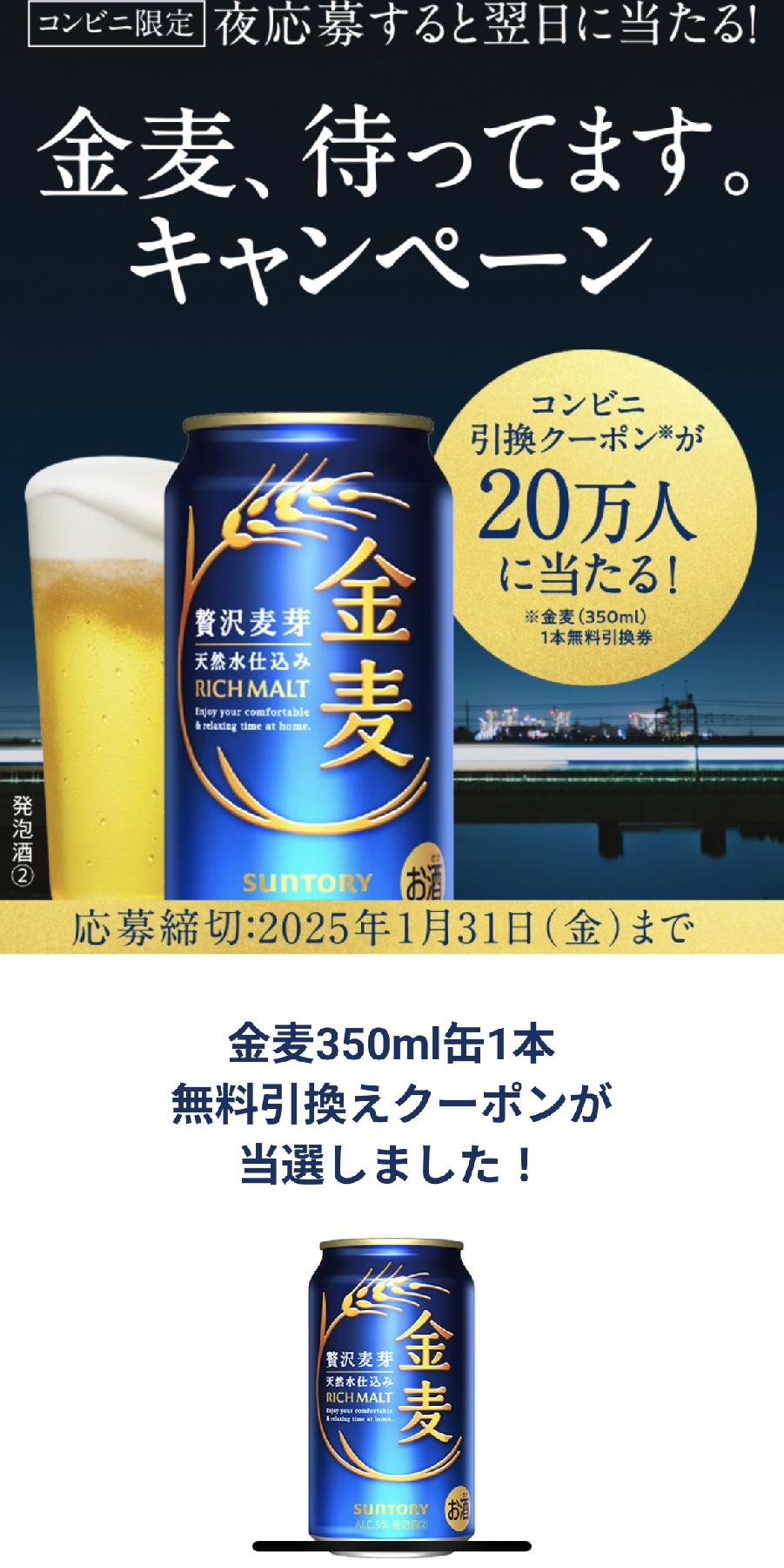 金麦 350ml缶1本引換え 無料クーポン