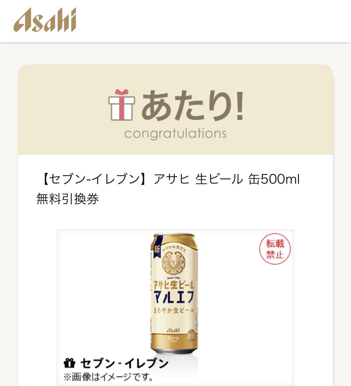 アサヒ 生ビール缶500ml 無料引換券