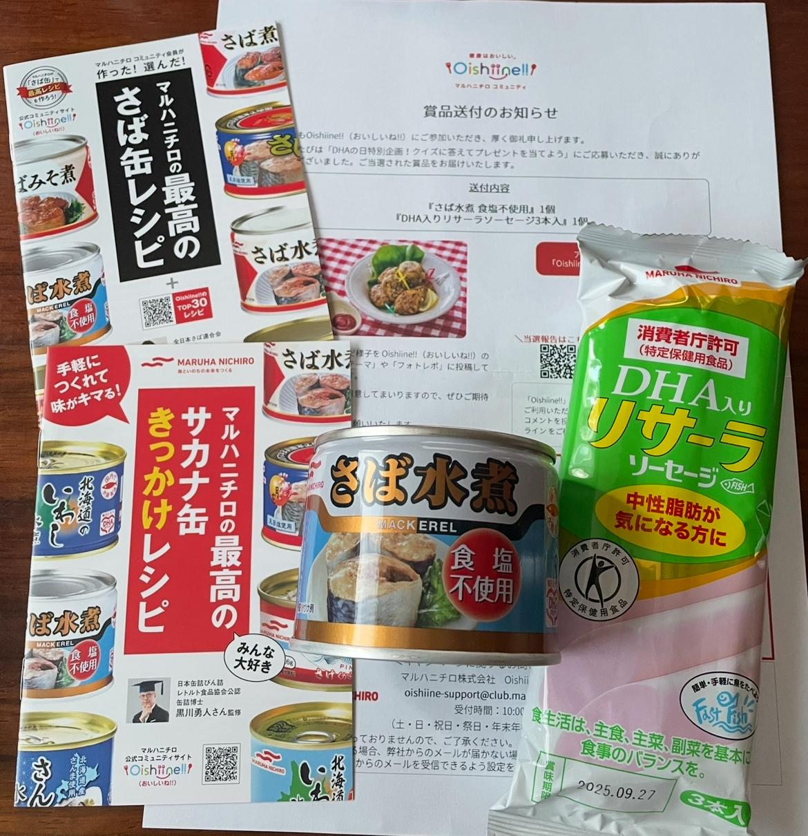 『さば水煮食塩不使用』1個 『DHA入りリサーラソーセージ3本入」1個