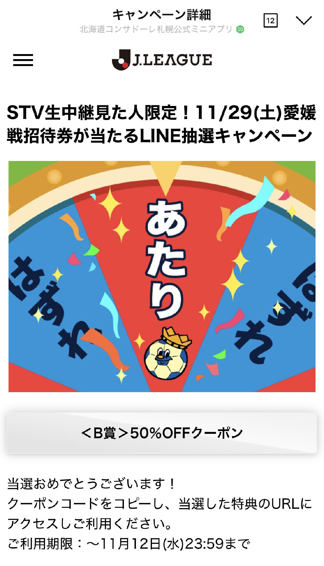 愛媛 戦招待券<B賞>50%OFFクーポン