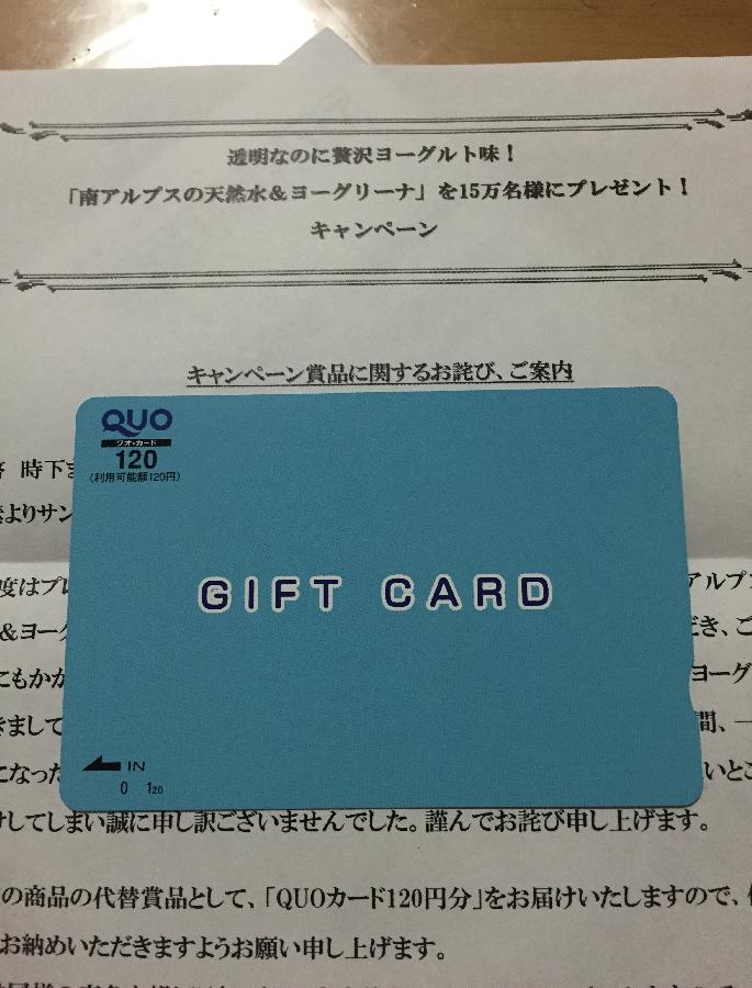 南アルプスの天然水&ヨーグリーナ代替品QUOカード